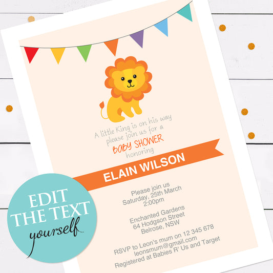 lion birthday or baby shower invite - INSTANT DOWNLOAD PDF