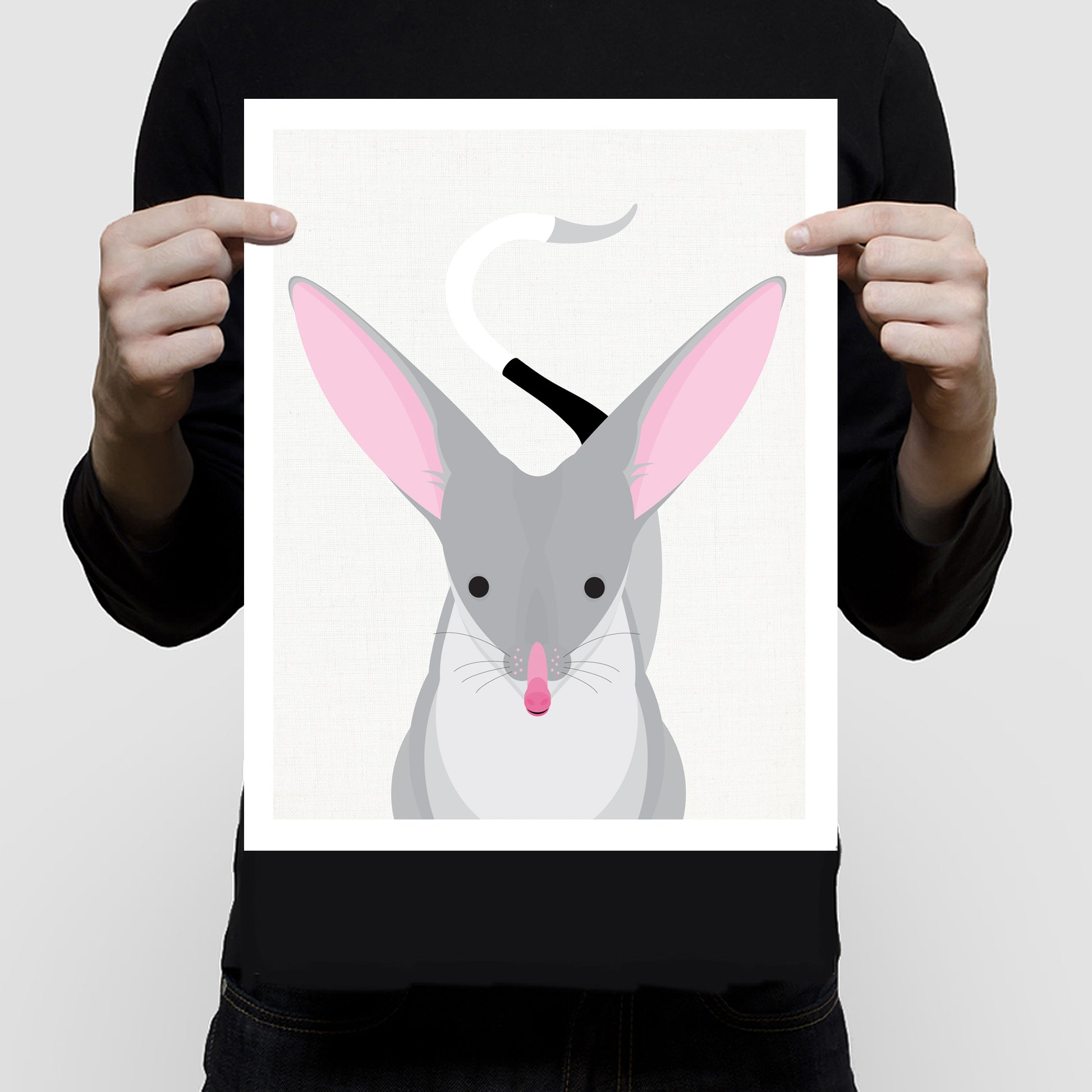 Add a touch of whimsy to your child's room with this delightful bilby print. Known for its large ears and sweet nature, the bilby is a beloved Australian marsupial, perfect for a nursery or playroom. Did you know bilbies are sometimes shown as an alternative to a bunny at Easter in Australia.