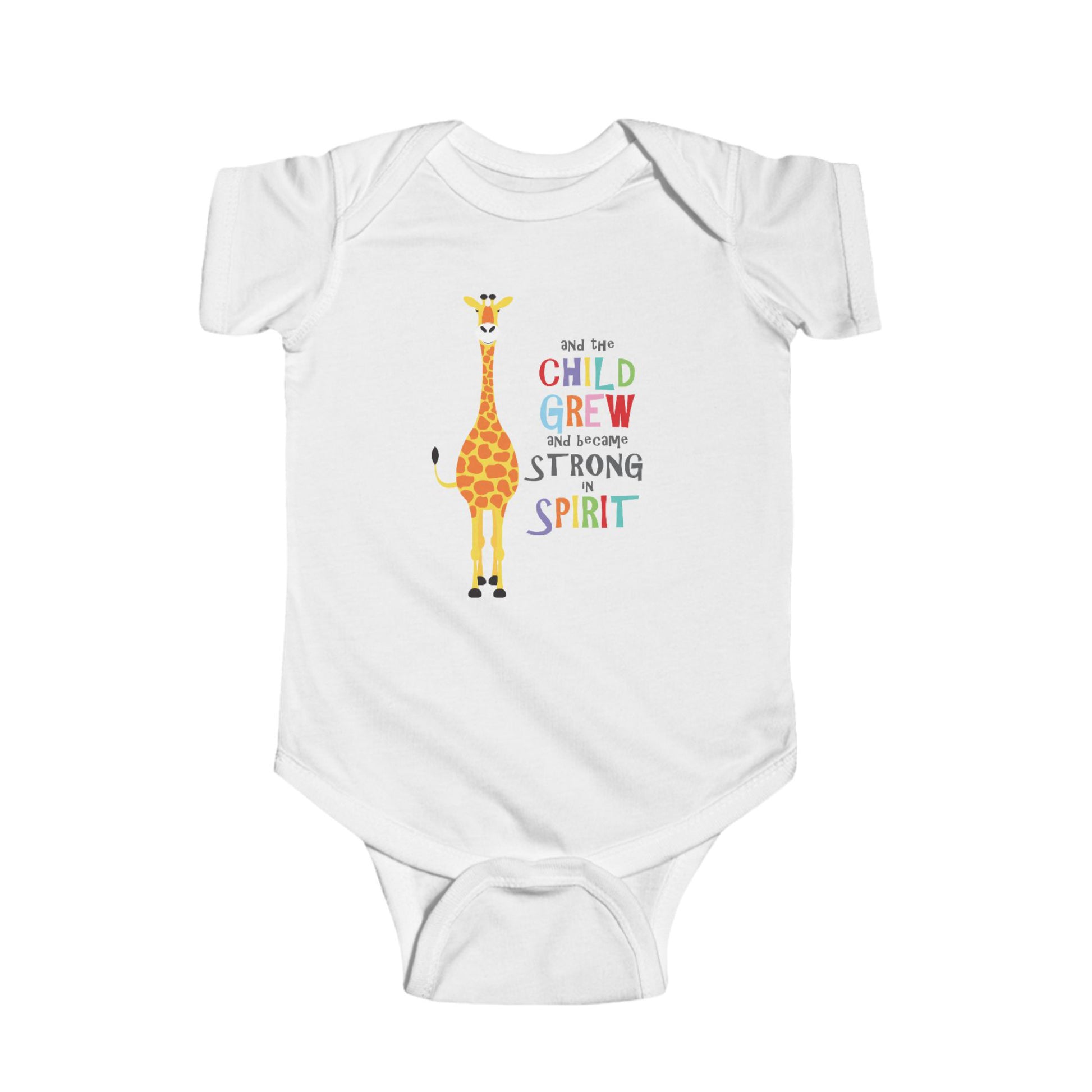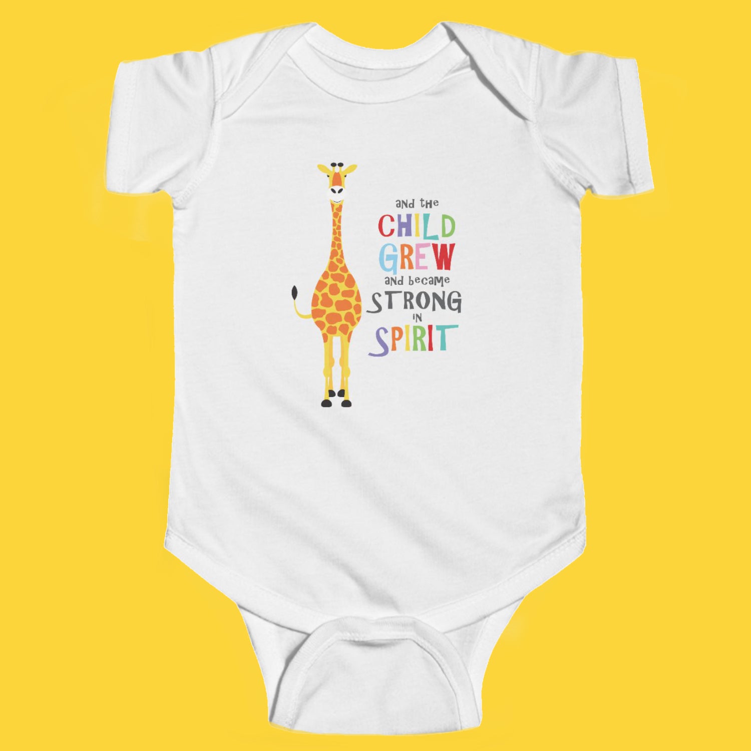 Celebrate your little one's growth with this adorable baby bodysuit featuring a cheerful giraffe and the uplifting message, "And the child grew and became strong in spirit" from Luke 2:40. Made from soft, comfy fabric, it's a perfect addition to any baby's wardrobe and a thoughtful gift for new parents.