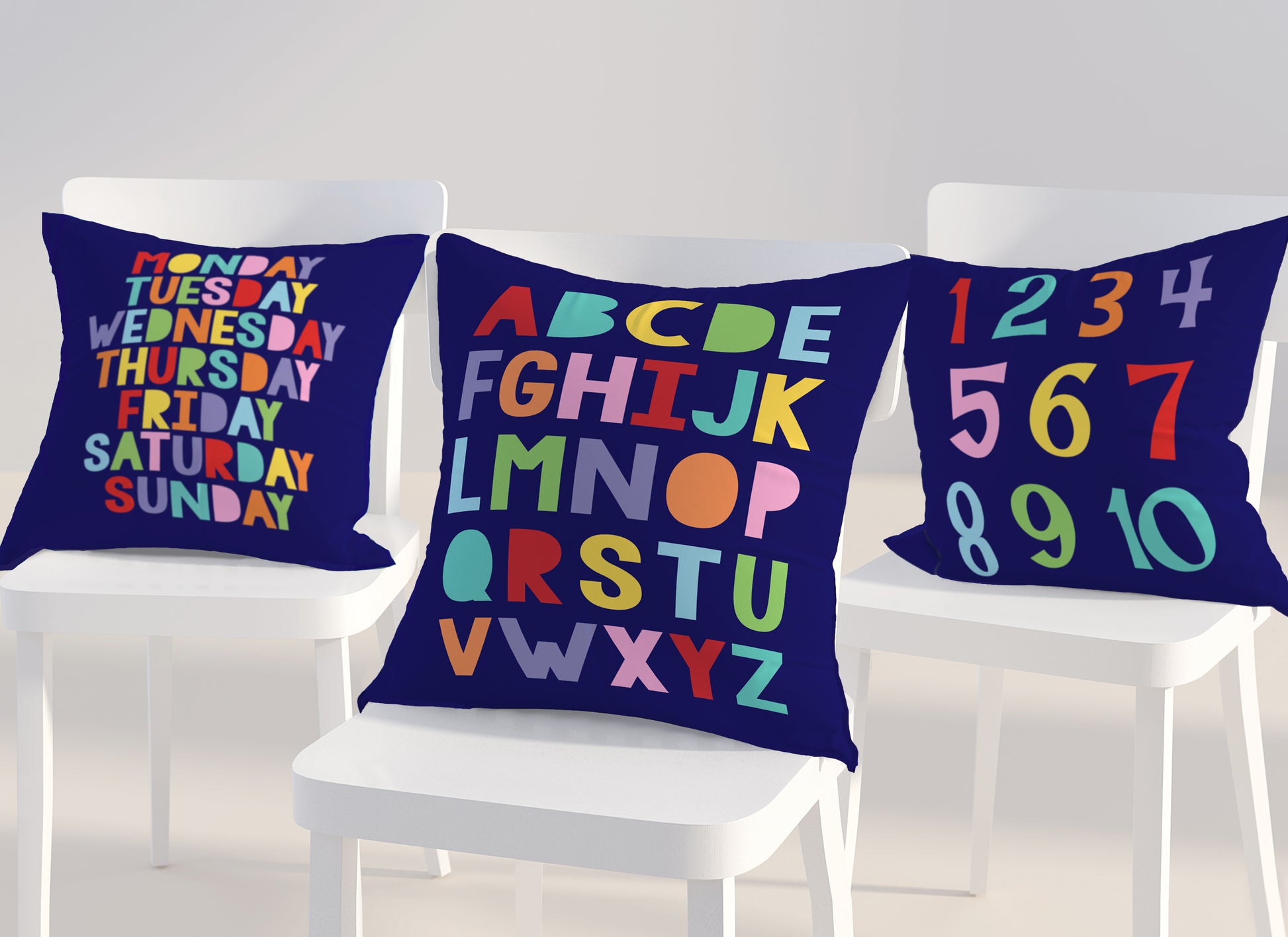 Brighten up the nursery or playroom with this adorable alphabet cushion cover in a mix of bright colours. A fun and educational ABCs decoration for girls or boys. Vibrant original artwork by us, Australian based creative monsoon. Dark blue on the back.