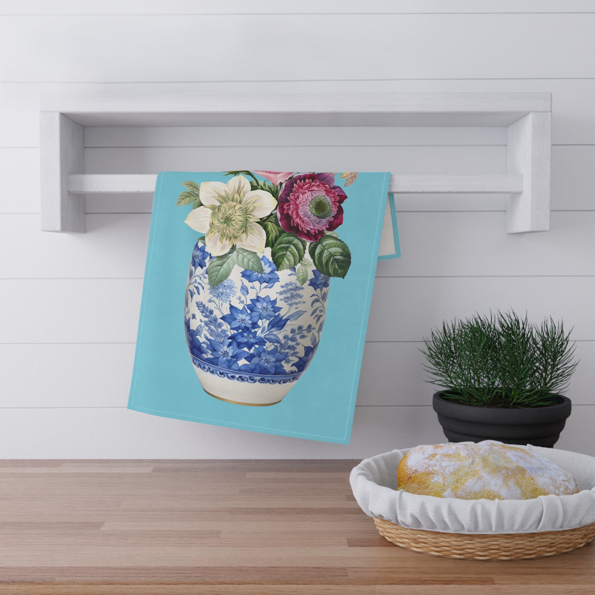 Transform your kitchen with this exquisite tea towel, showcasing a beautiful blend of pink roses and delicate anemone flowers elegantly displayed in a classic blue and white china ginger jar. Made from premium Cotton Twill, this tea towel is perfect for everyday use or as a charming decorative piece that brings a fresh and vibrant touch to your kitchen!