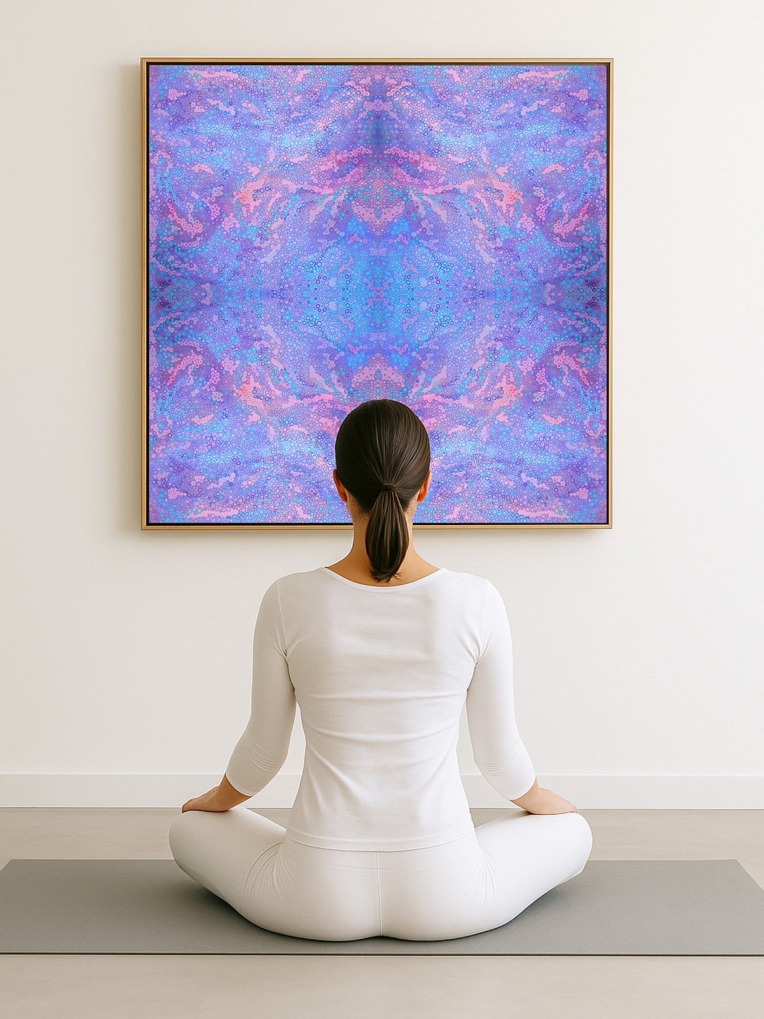 Jacaranda Blue is a limited edition mandala art print created as a kaleidoscopic interpretation of an original painting inspired by flowering jacaranda trees. Hundreds of dots and circular forms in varying sizes come together in layered blue and violet tones, echoing the soft colour and rhythm of jacaranda blooms in spring.