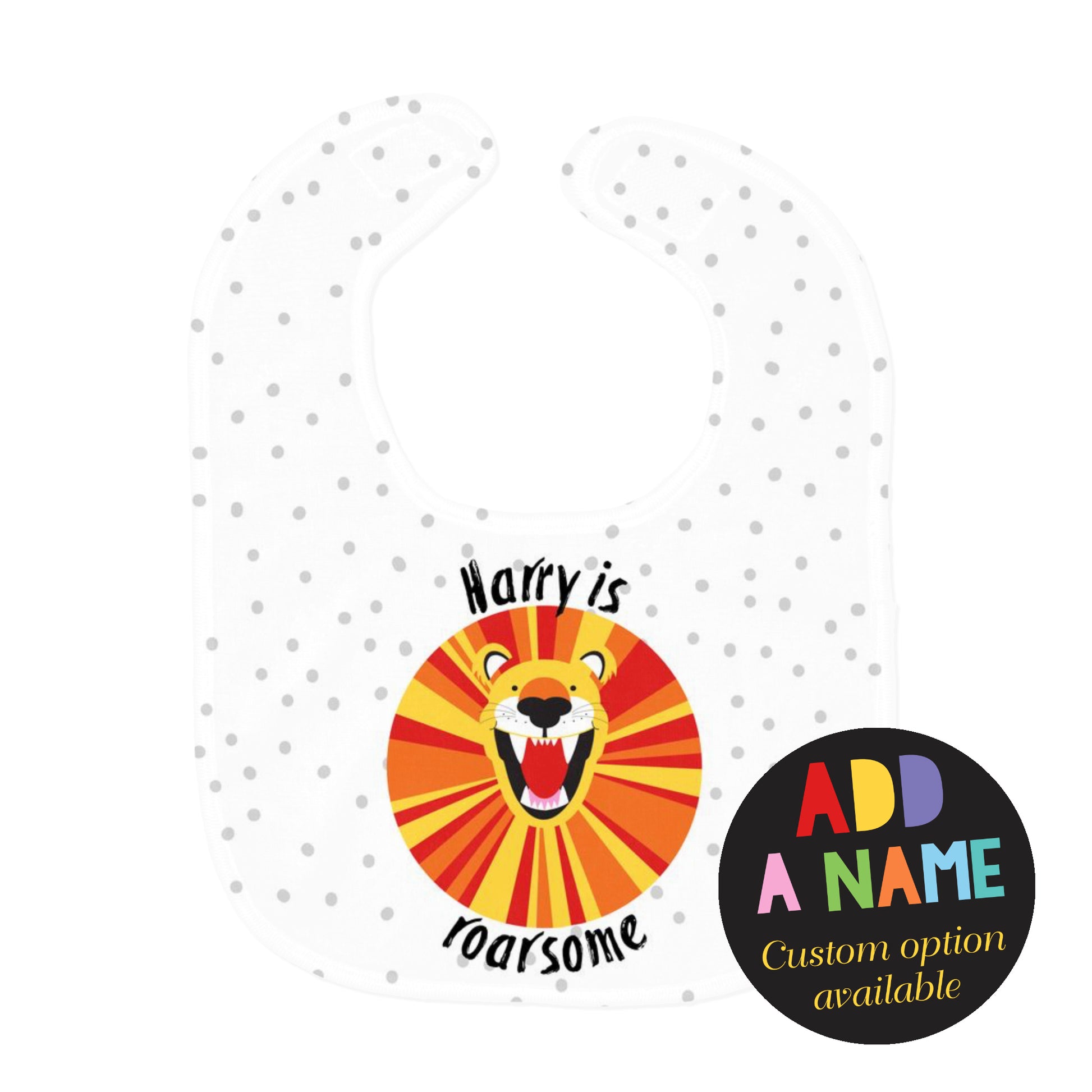 Make mealtime roarsome with this adorable lion themed baby bib set! This playful set includes a colourful all over lion pattern bib, a personalised “Roarsome” bib (add the baby’s name in the Name box), and a “Hungry as” bib. Perfect for new arrivals, baby showers, or little cubs ready to roar into snack time!