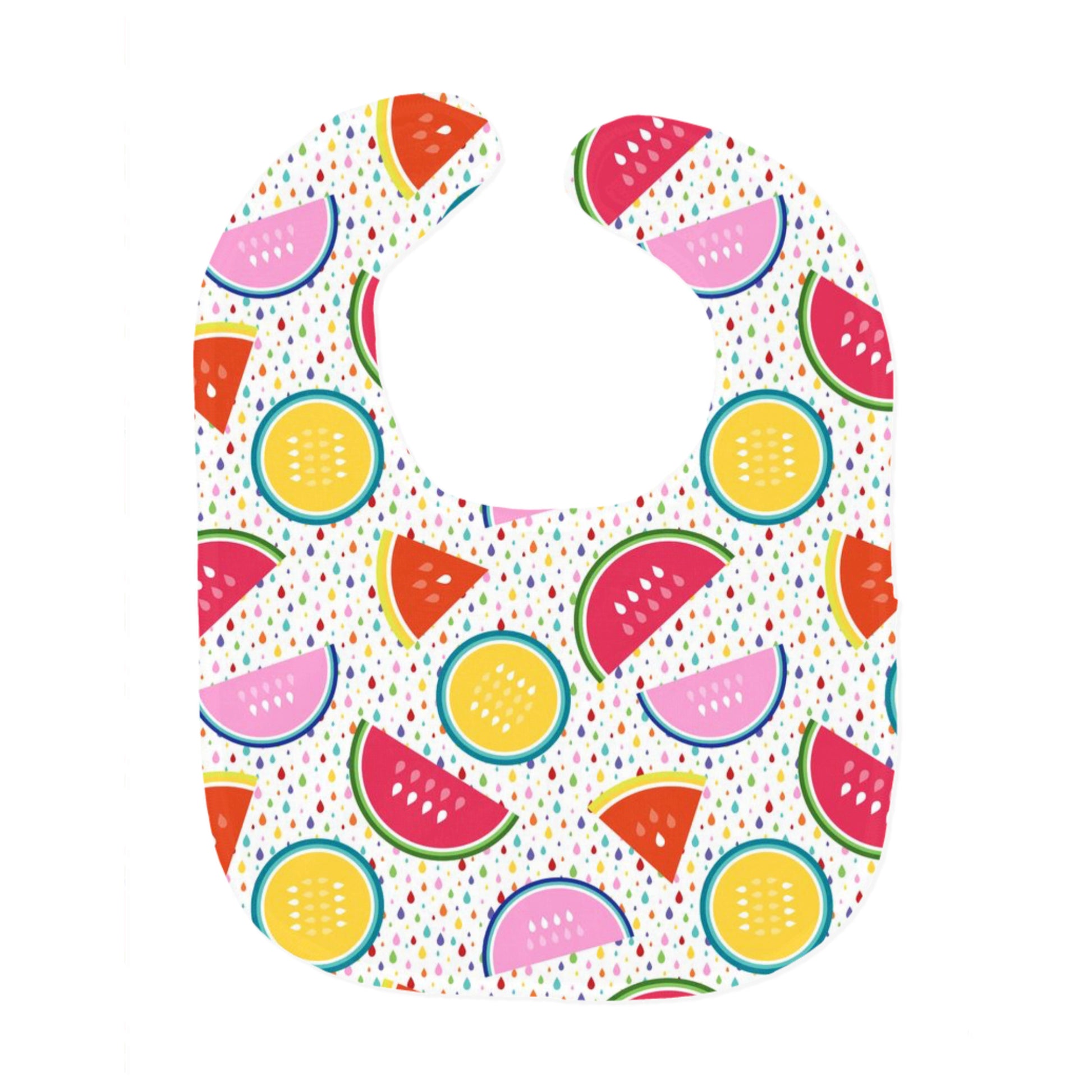 Make mealtime extra sweet with this adorable fruity themed baby bib set! This vibrant set features a fun all over fruit pattern bib, a personalised “One in a Melon” bib (add the baby’s name in the Name box) and a “Squeeze the Day” bib with a cheerful watermelon design. Perfect for new arrivals, baby showers or little ones ready to squeeze every moment of snack time!