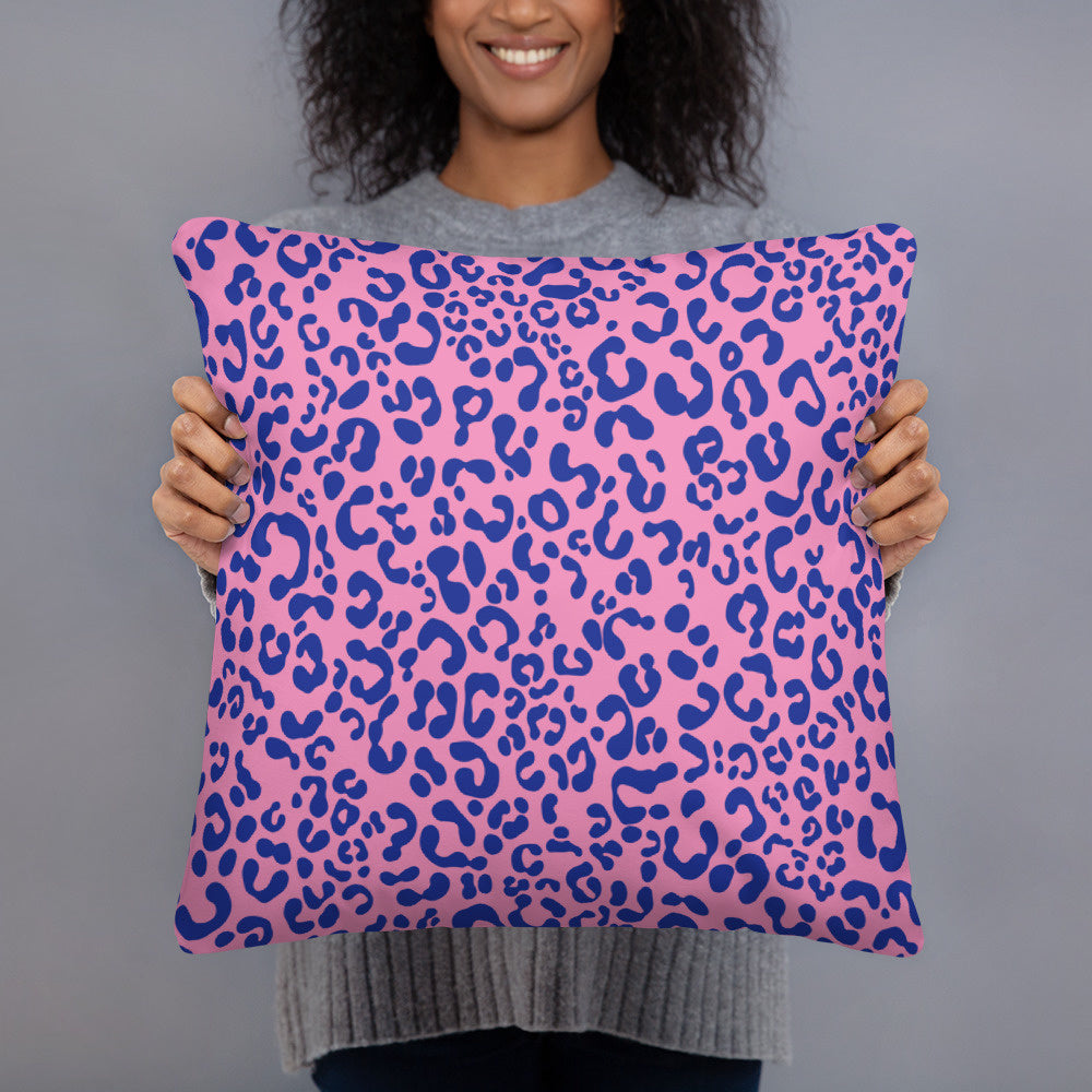 This vibrant pink and blue cushion cover features a striking leopard print pattern on the front and back. Perfect for adding a pop of personality to your living space or bedroom.