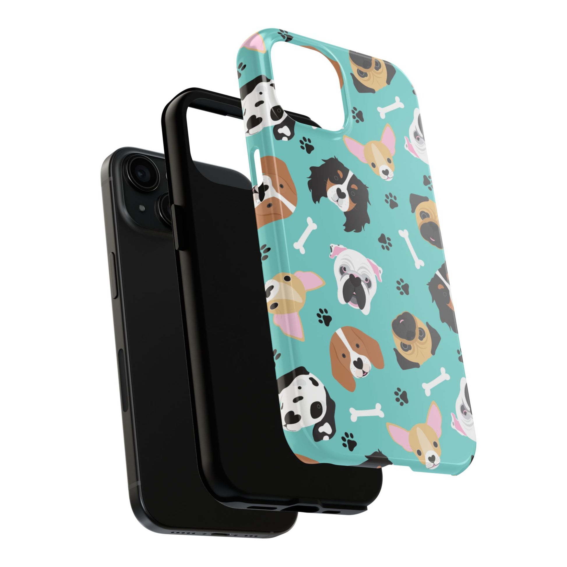 This phone case features cute dog faces in a vibrant array of colours set against a turquoise background, accented by playful paw prints and dog bone motifs. With its fun design and the Tough Case's durable protection and sleek, glossy finish, it combines style and functionality perfectly. Available for both iPhone and Samsung Galaxy models.