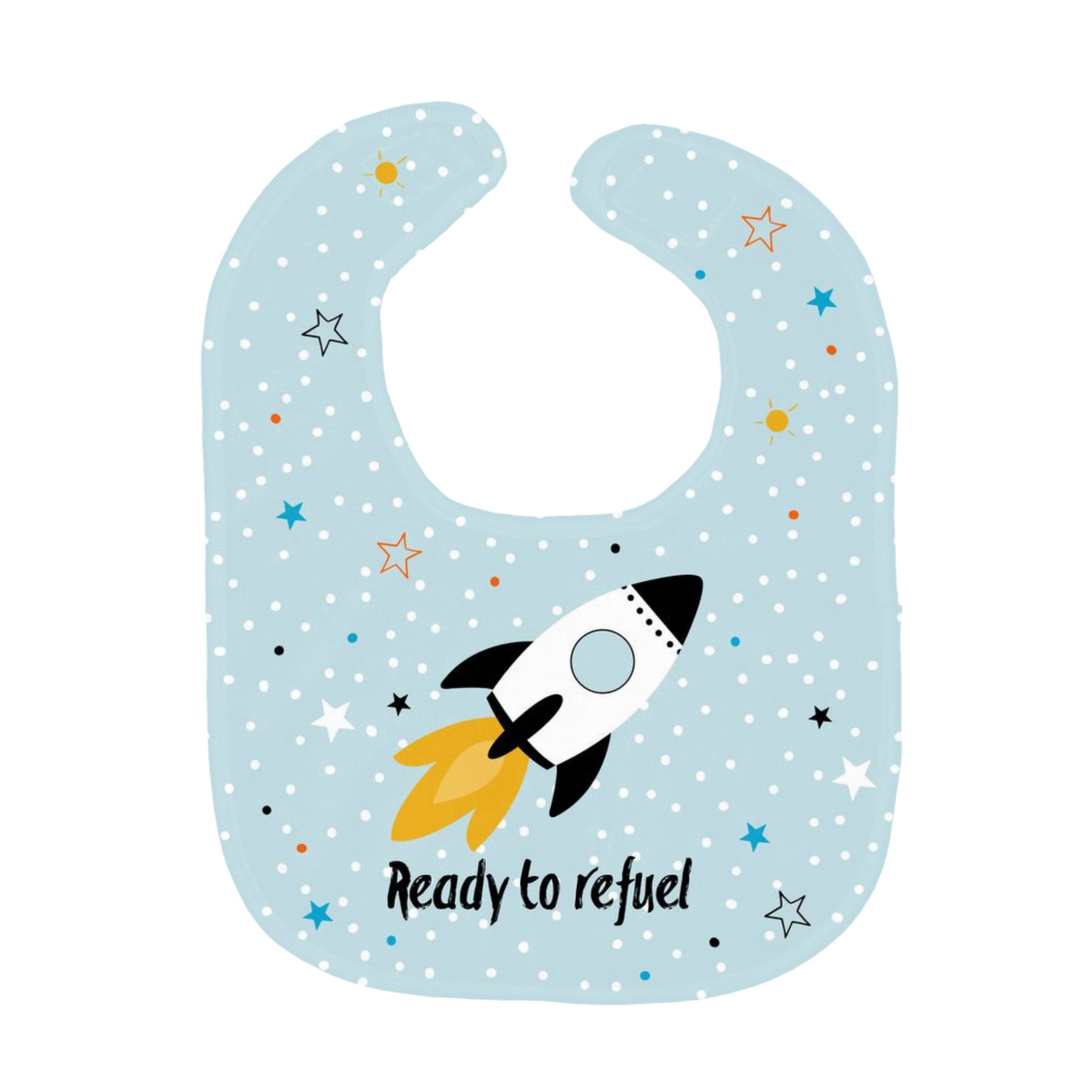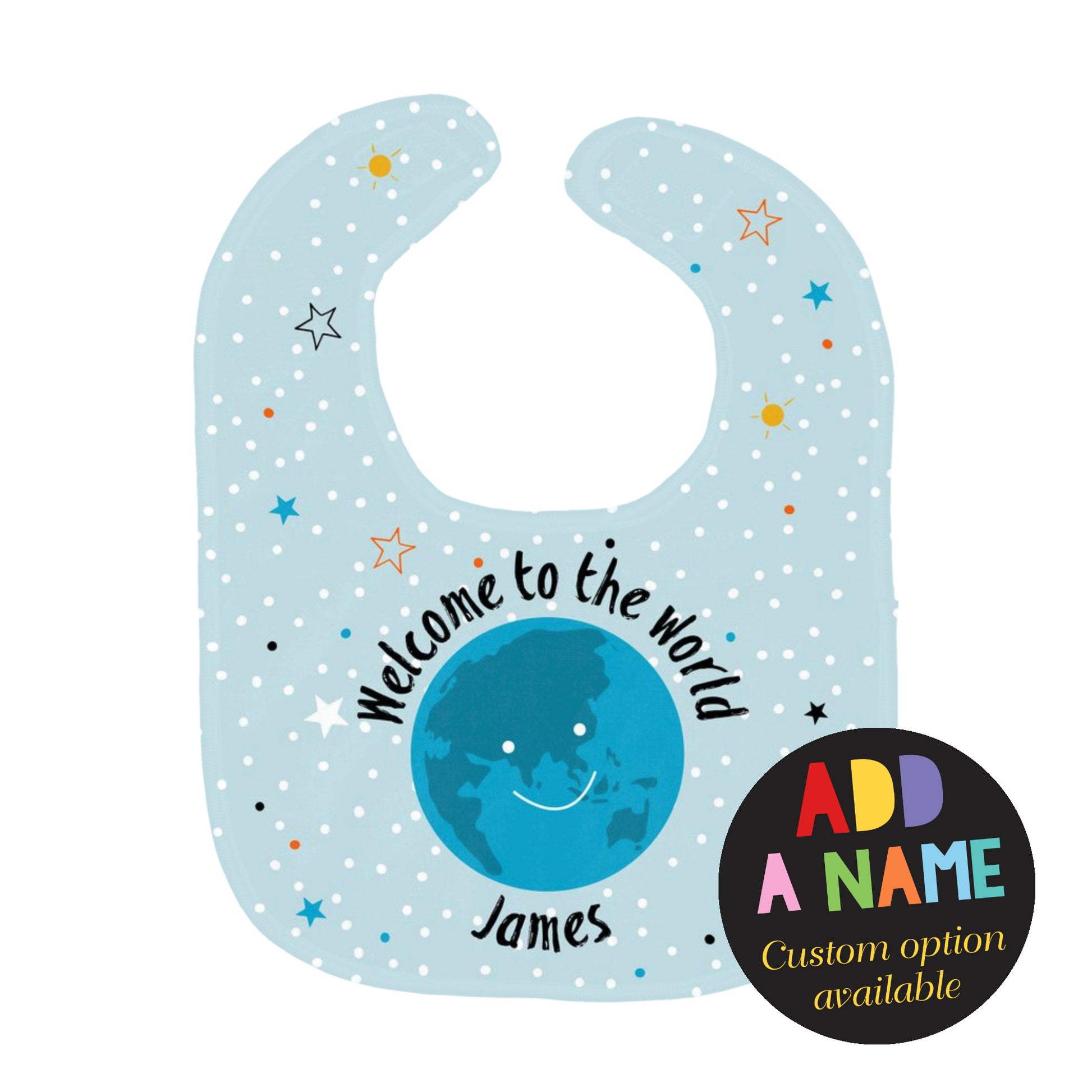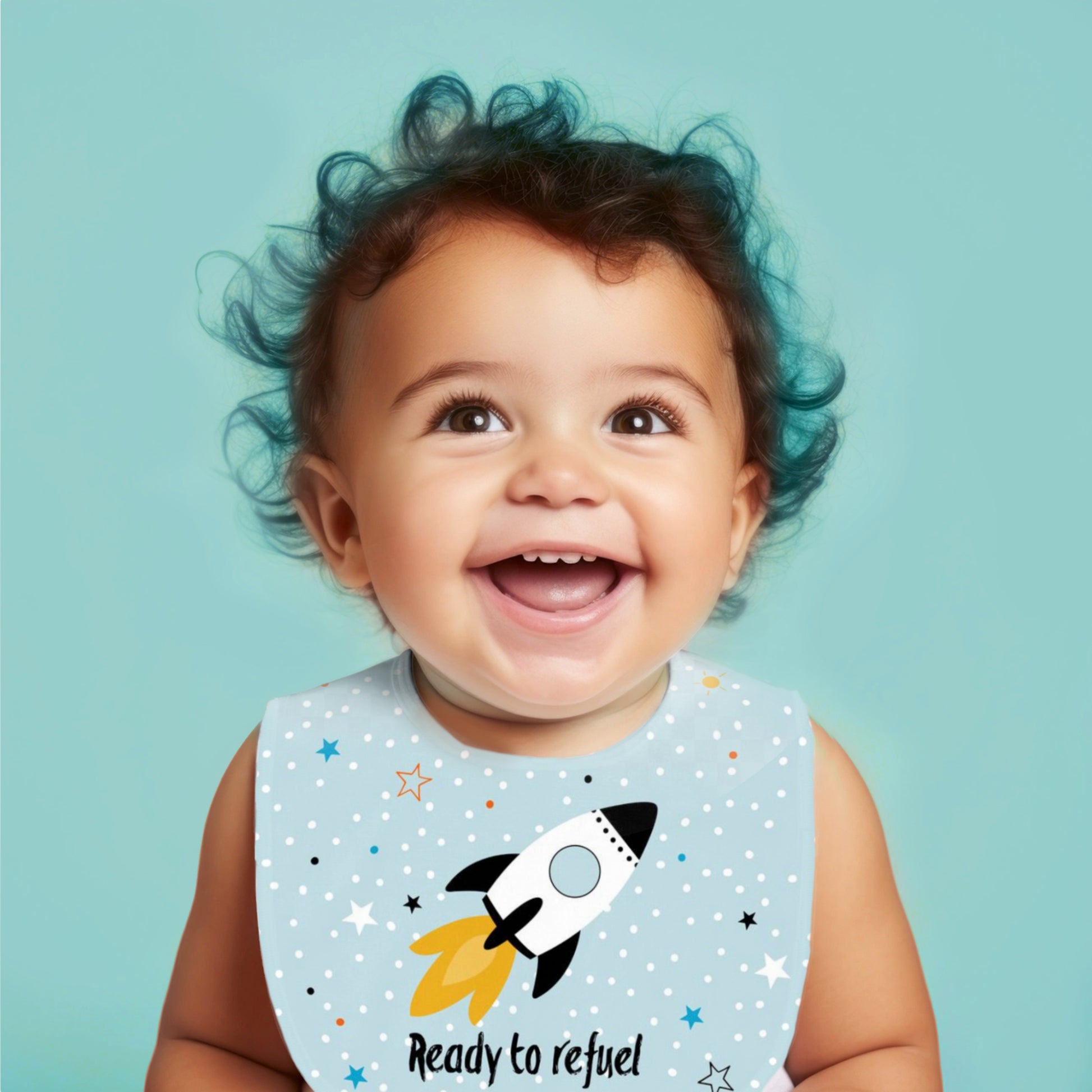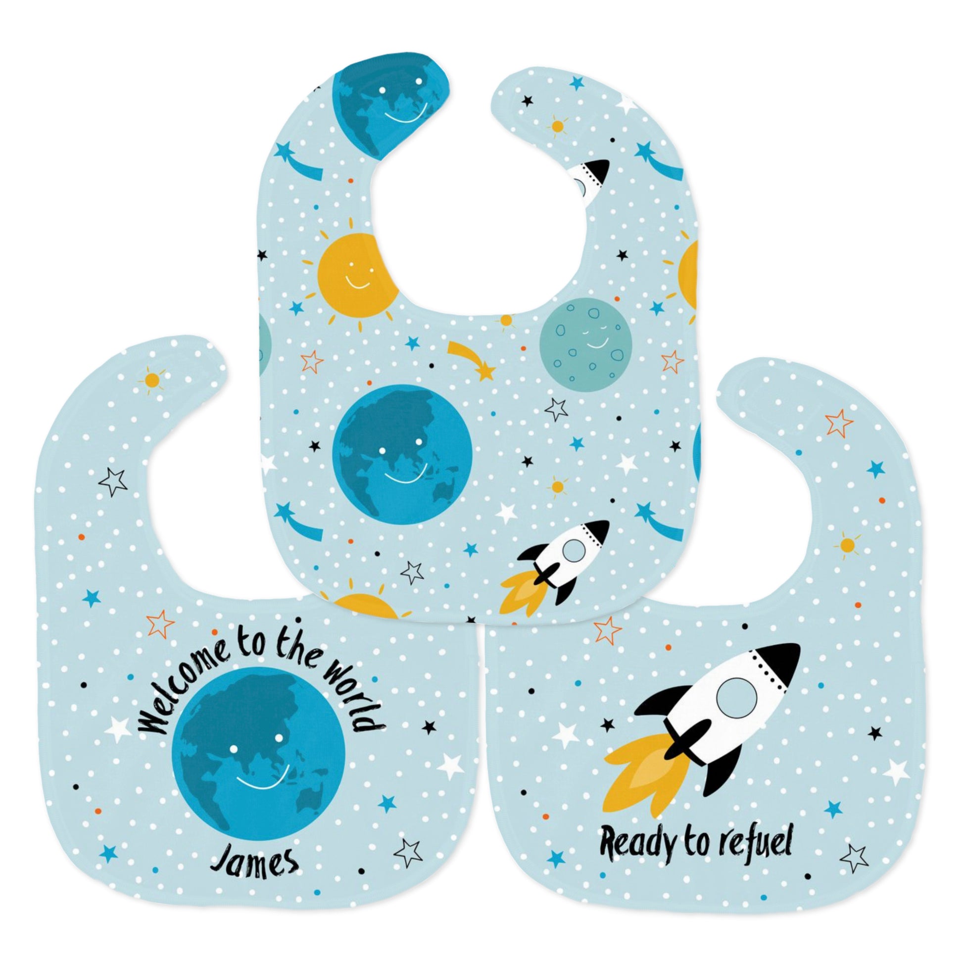 Blast off into mealtime with this adorable space themed baby bib set! Featuring a fun galaxy design, this set includes a colourful all over space pattern bib, a “Welcome to the World” personalised bib (add the baby’s name in the Name box) and a “Ready to Refuel” bib with a cute rocket illustration. Perfect for new arrivals, baby showers, or little explorers ready to launch into snack time.